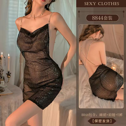 High Quality Shiny Hot Temptation Backless Perspective Women's Sexy Lingerie Short Skirt