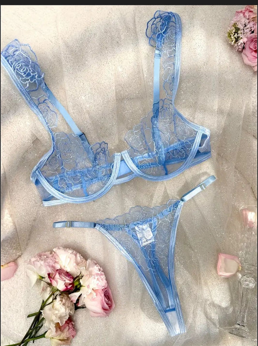 Floral Mesh Leaf embroidery Wire Bra Set Nonpadded